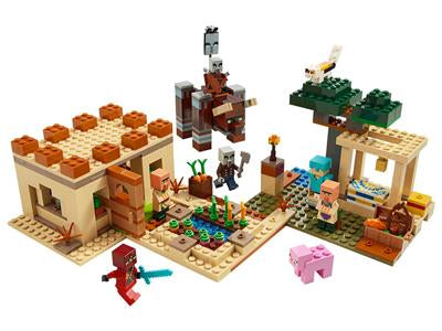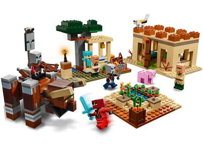 LEGO 21160 The Illager Raid is a 562 piece Minecraft set with 5 minifigs released in 2020. It includes a 3-section Minecraft village with a house, trading post, and a field with crops. The set includes five minifigures: two Villagers, two Illagers, and Kai. It was retired in November 2022 with a lifespan of 34 months.