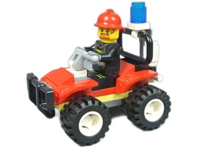 LEGO 30361 Fire ATV was a 39 piece City set with 1 minifig released in 2019. It features a small buggy with black tires, red hood, light gray handlebar, blue lights, and a firefighter minifigure with a siren and red hatchet.