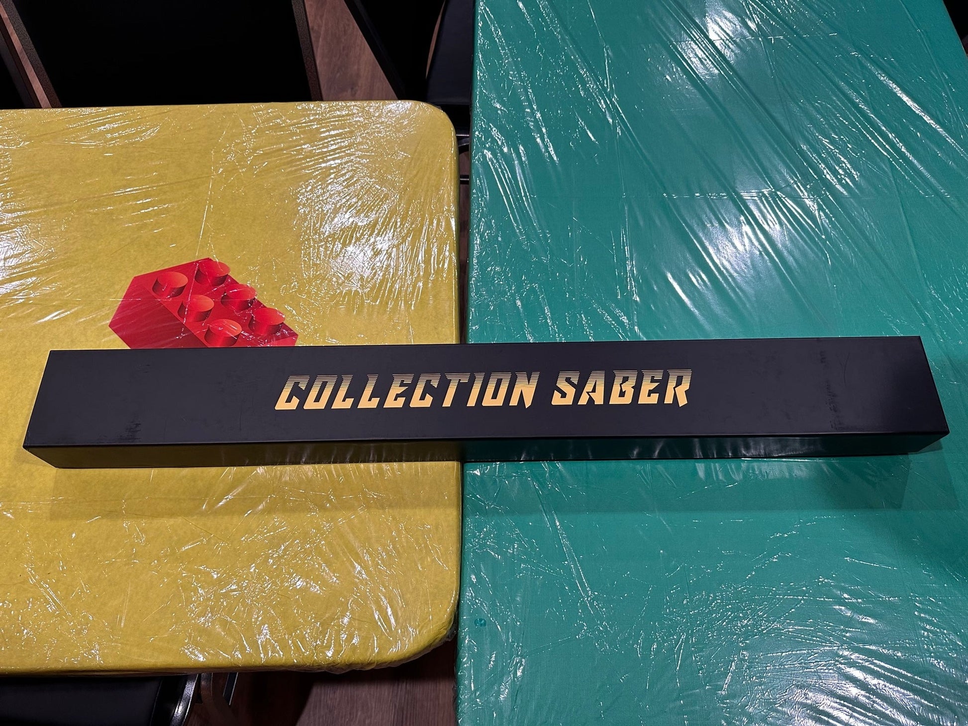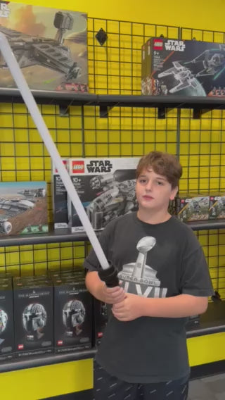 This is a custom made lightsaber that mimics the LEGO style handle/hilt of the lightsaber base. It has sound effects, changes color, and programmed phrases.