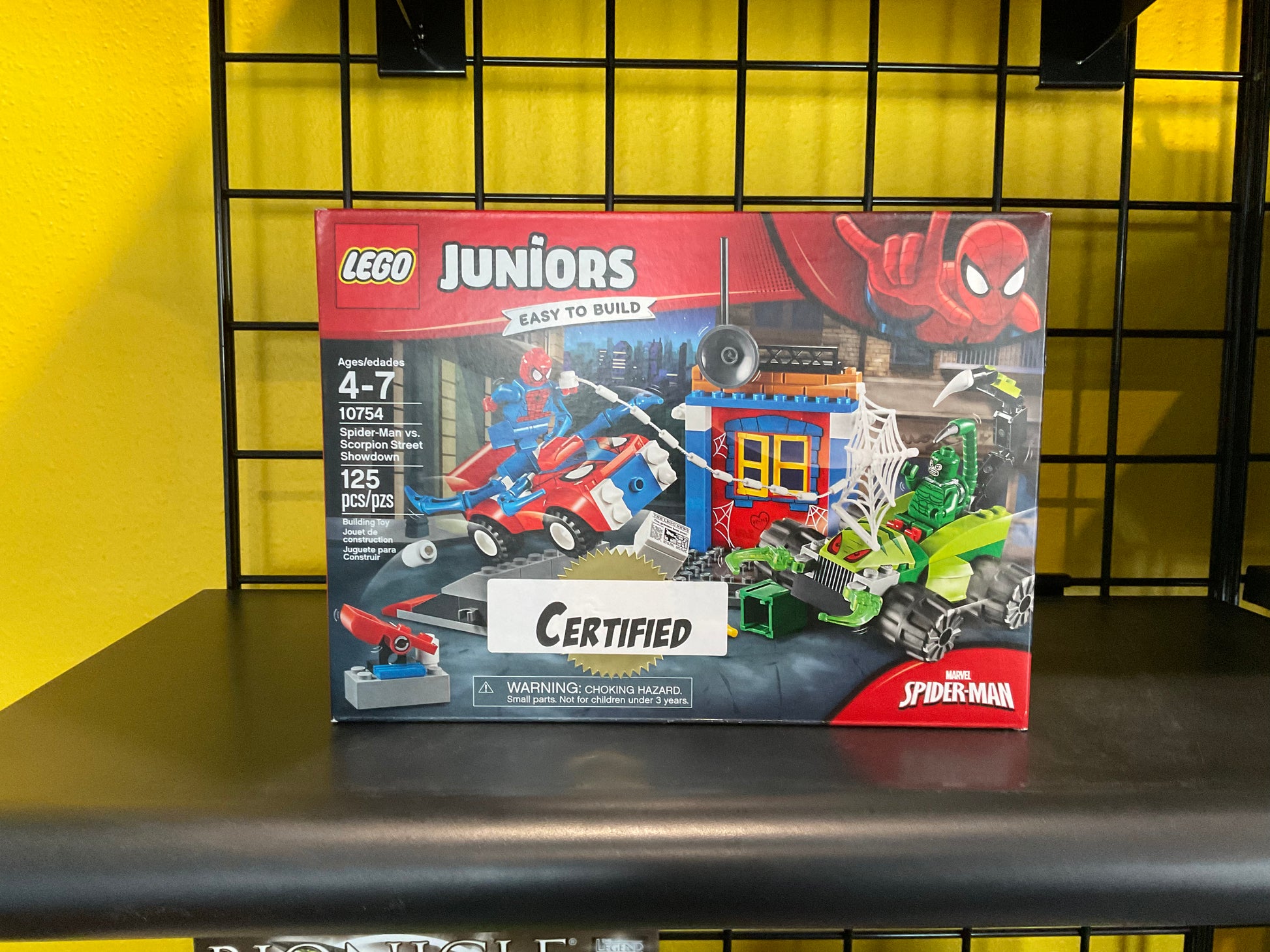 LEGO 10754 Spider-Man vs. Scorpion Street Showdown was a 125 piece Juniors set with 2 minifigs released in 2018.
