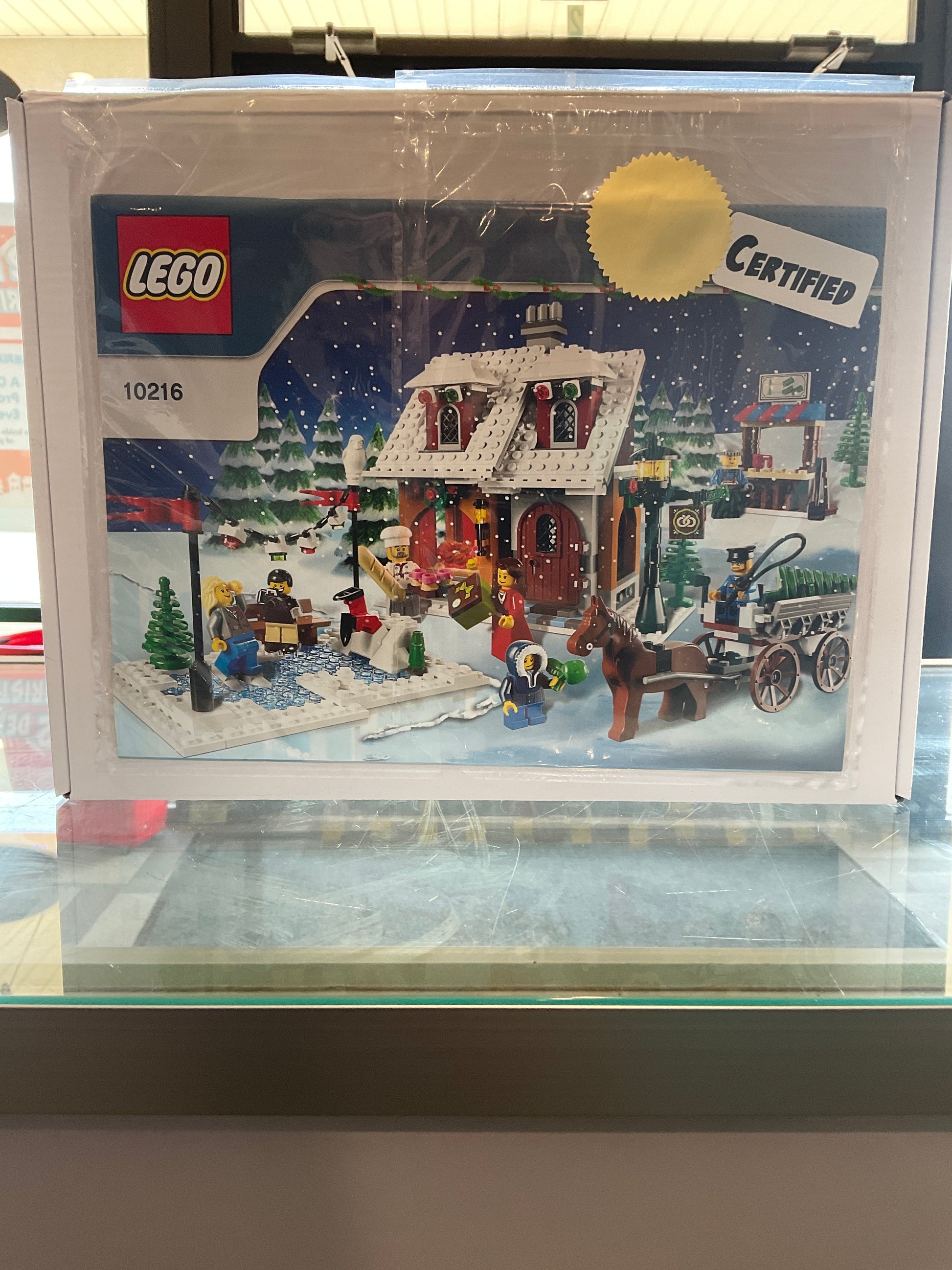 LEGO 10216 Winter Village Bakery is a 687 piece Advanced Models set with 9 minifigs released in 2010. It features a bakery with interior lighting via a light-up brick, a frozen pond, a tree seller's stand and a horse-drawn cart. It was retired in December 2012.