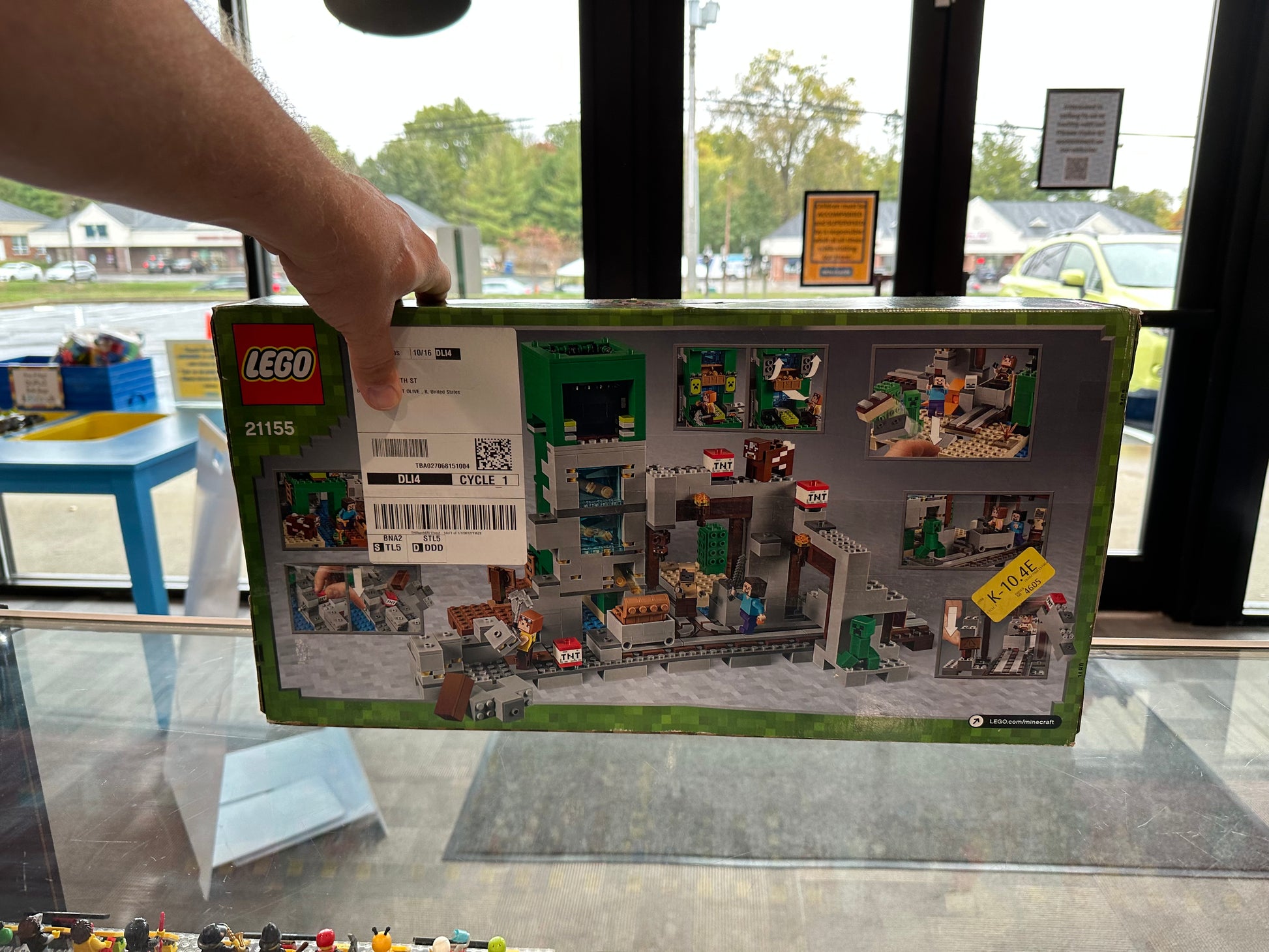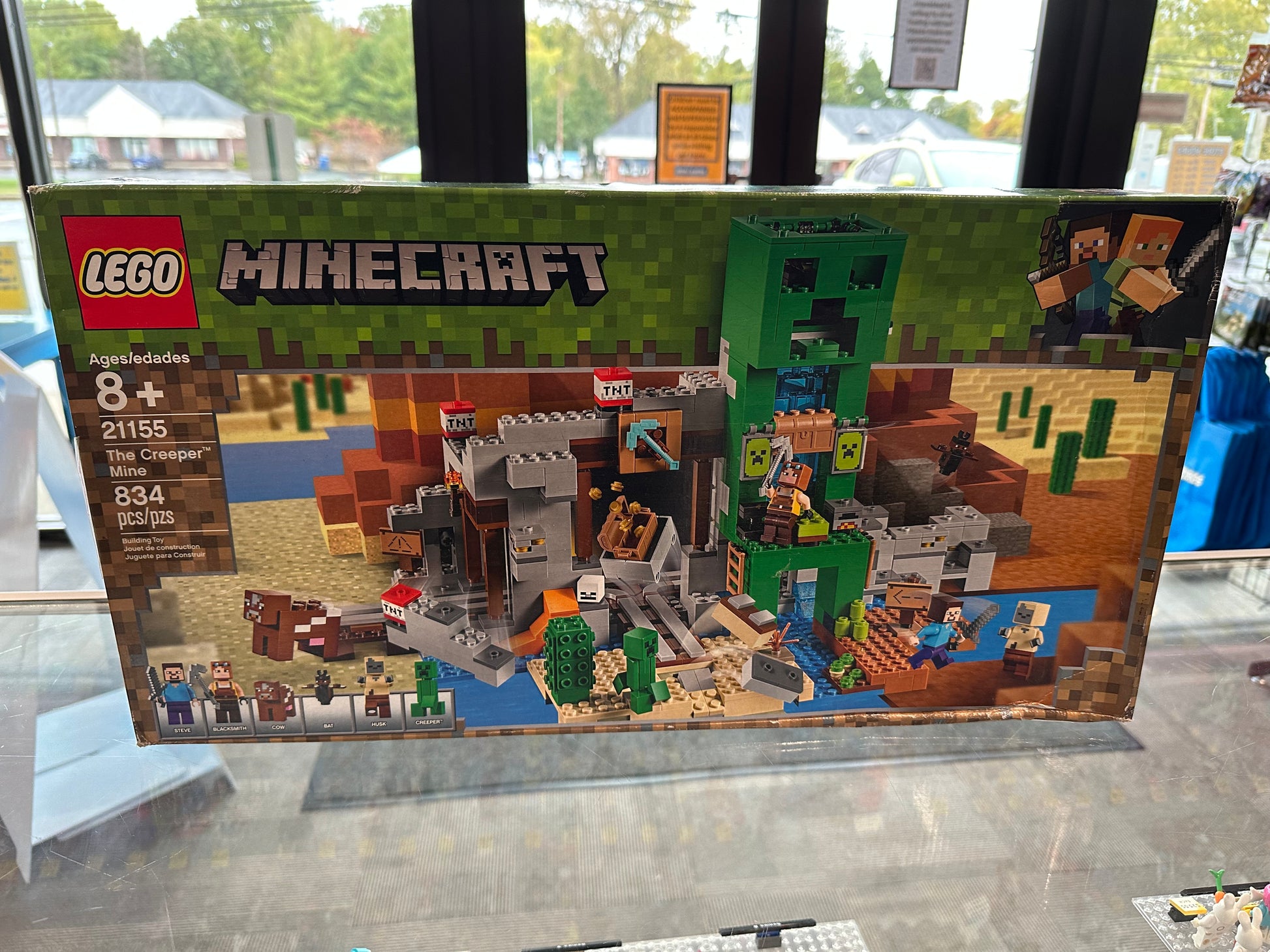 LEGO 21155 The Creeper Mine is a 834 piece Minecraft set with 4 minifigs released in 2019. It features a minecart, a Creeper, a husk, TNT blasting function, a giant Creeper statue for storing mined gold, and a chest to collect the gold. The set's minifigures include Steve, blacksmith a husk, Creeper, cow and bat figures. It was retired in July 2021 with a lifespan of 23 months.