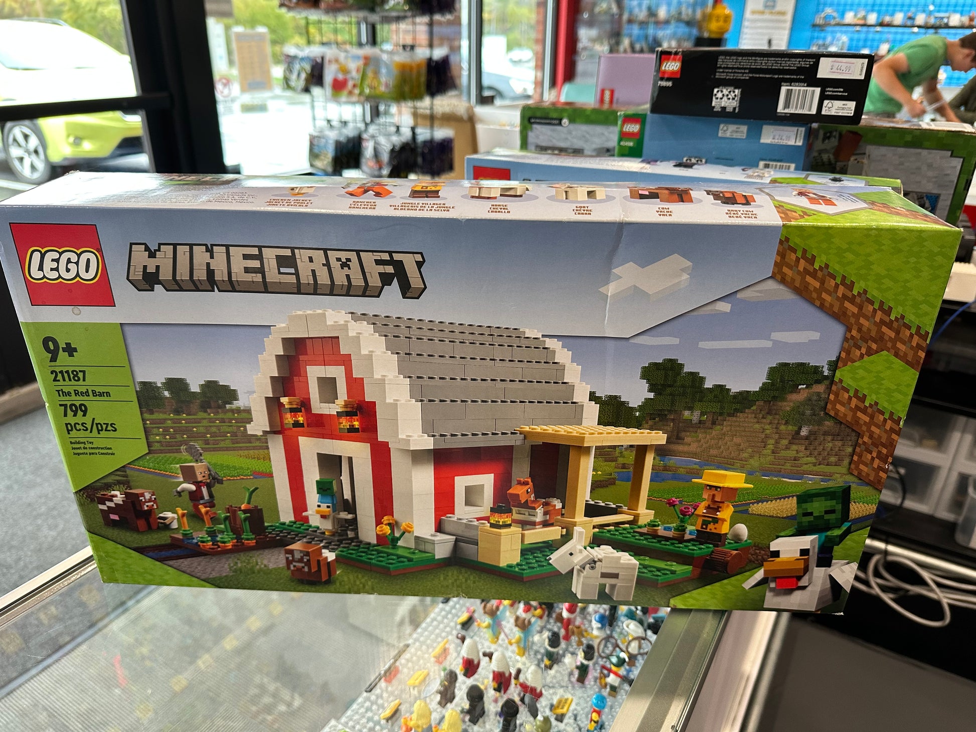 LEGO 21187 The Red Barn is a 799 piece Minecraft set with 3 minifigs released in 2022. It consists of a hinged, openable red barn with interior play space, farm animals, crops, and minifigures including a baby zombie on a chicken. It was retired in August of 2023.