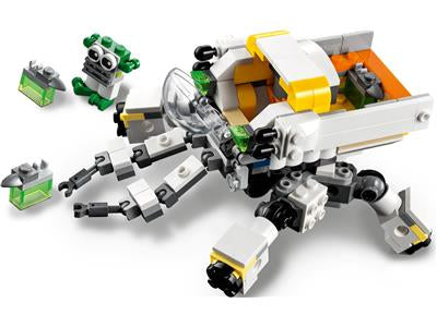 LEGO 31115 Space Mining Mech is a Creator 3-in-1 set released in 2021 with 327 pieces. It builds a posable mining mech with articulated legs and arms, a spinning buzz saw, a jetpack, and a scene with crystals and a small green alien. Alternate builds include a posable four-legged cargo carrier with a robot pilot and a two-legged robot. The models emphasize mechanical articulation and can be rebuilt to explore different space mining roles.