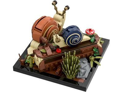 LEGO 40788 Ideas Friendly Snails is a 264 piece Ideas set released in 2025. It features two snails with decorated shells, a bee, a log, a rock, a puddle, and greenery on a single base. The snails can be detached and repositioned beyond the main base. It was free as a GWP with qualifying purchases at LEGO.com, July 2025.
