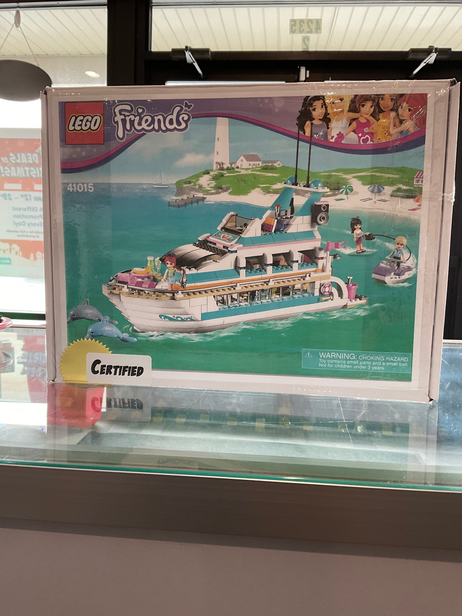 LEGO 41015 Dolphin Cruiser is a 612 piece Friends set with 3 mini-doll figures released in 2013. It features a cruiser with a steering area, waterslide, personal water scooter, and sonar. Includes figures named Mia, Maya, and Andrew, along with chaise lounges, a picnic table, and a snack bar. It was retired in January 2016.