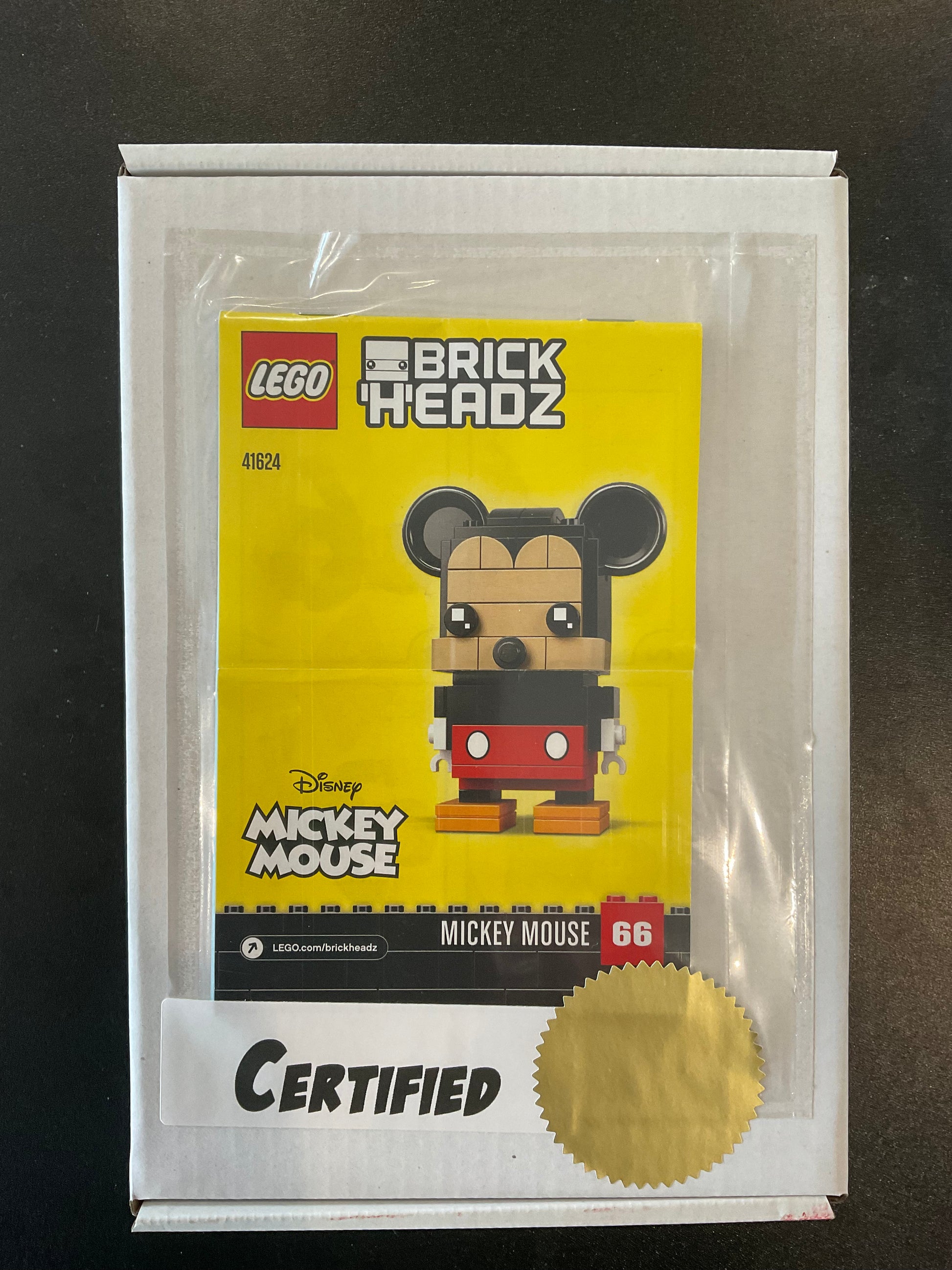 LEGO 41624 Mickey Mouse is a 109 piece BrickHeadz set released and retired in 2018. It features a buildable Mickey Mouse character with big black ears, red shorts, and a tail.