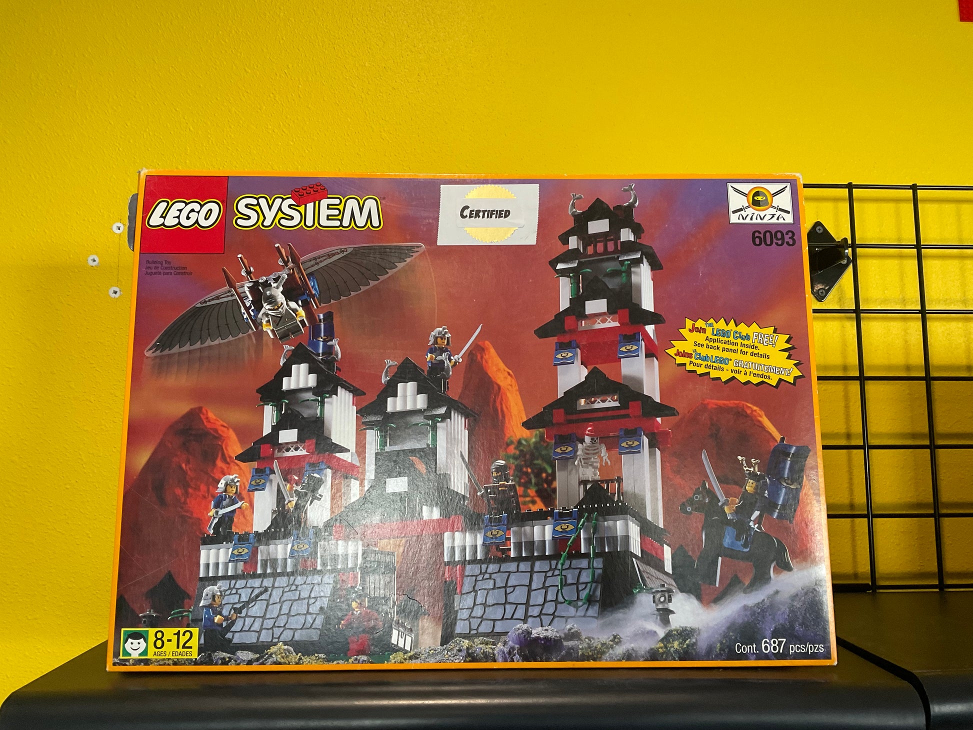 LEGO 6093 Flying Ninja Fortress was a 694 piece Castle set with 9 minifigs released in 1998. It was also called "The Fortress Of The Full Moon". Its 9 minifigures include Bonsai, Ito, Robber Chief, Kata and Gi-Dan minifigures and in total has four Ninjas, two Samurai, two Shogun Guards, and a skeleton.