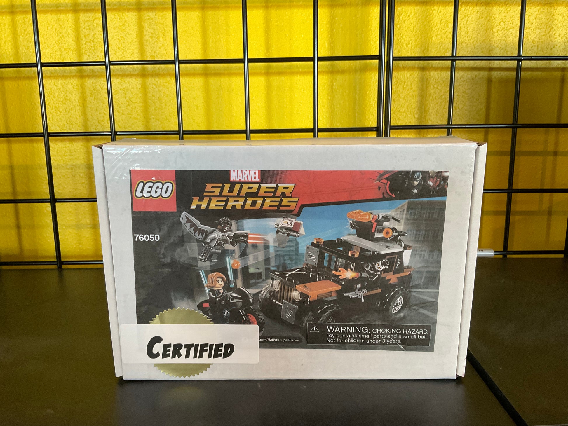 LEGO 76050 Crossbones' Hazard Heist was a 179 piece Marvel Super Heroes set with 3 minifigs released in 2016. It features an armored truck with removable roof, 2 stud shooters, storage container, and explode function. It includes Falcon's detachable Redwing drone, Black Widow's bike, and 3 minifigures: Crossbones, Black Widow, and Falcon.