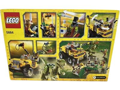 LEGO 5884 Raptor Chase is a 259 piece Dino set with 2 minifigs released in 2012. It features a Raptor dinosaur, two minifigures, a big-wheeled off-roader with a lasso, a tranquilizer gun, and two flick missiles.